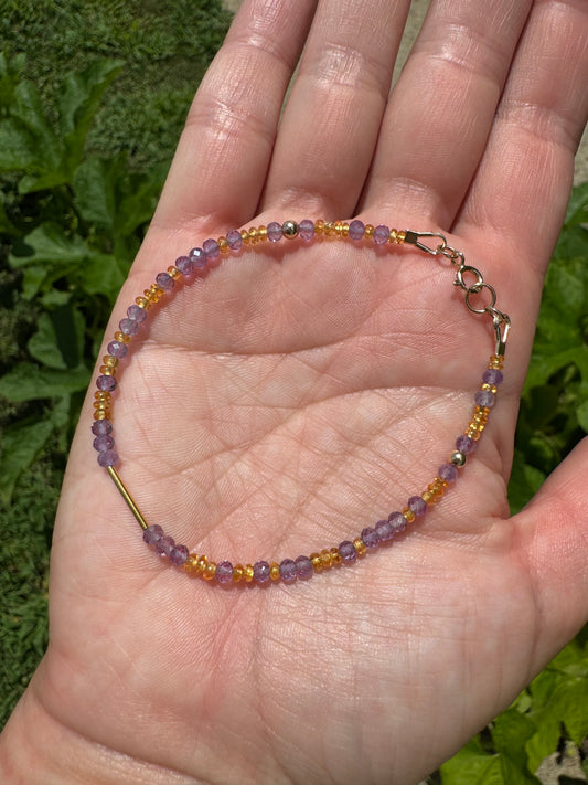 Scattered Light Bracelet 18k gold accent, Mandarin Garnet and Rose de France Amethyst, 14k clasp