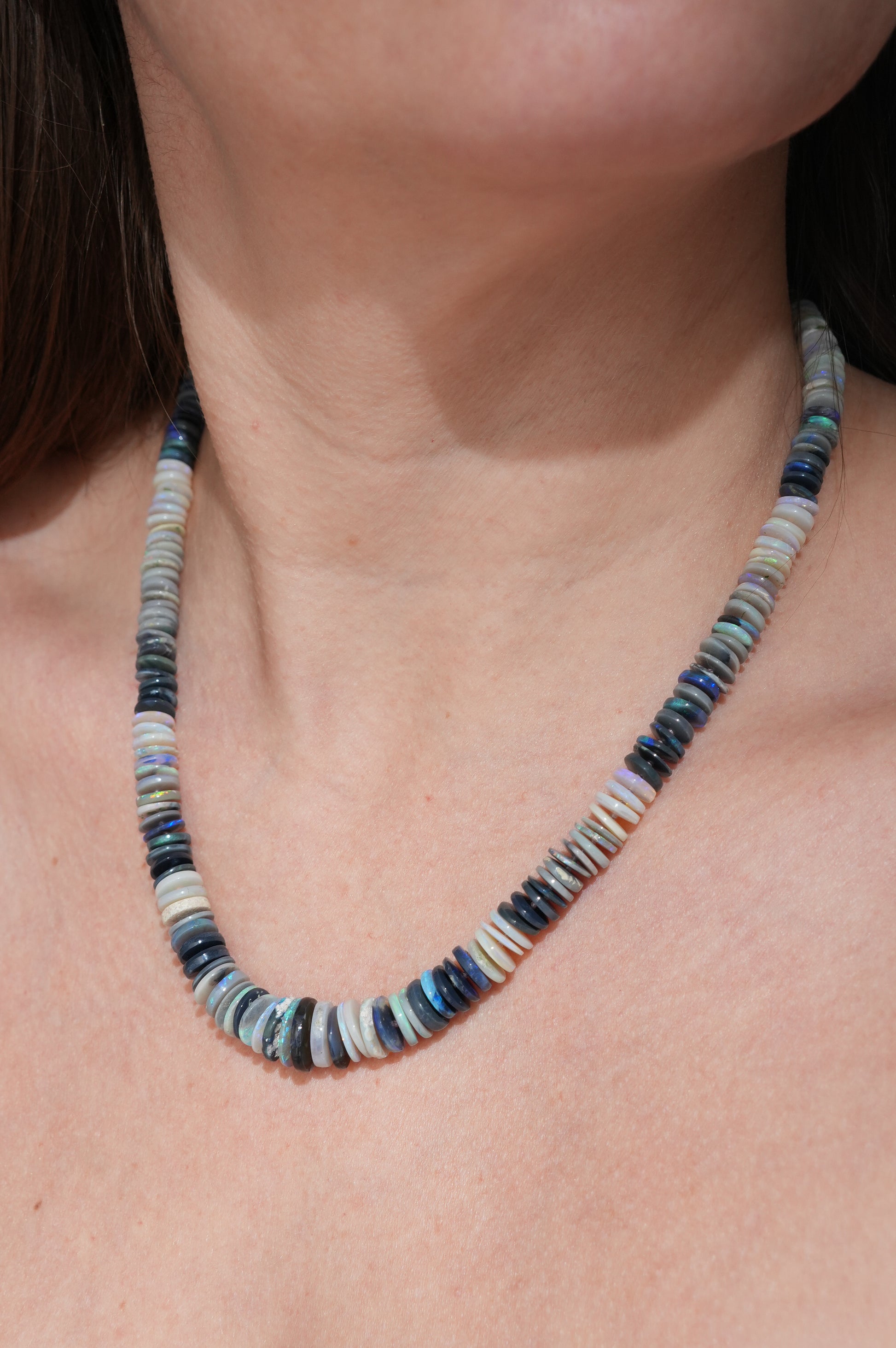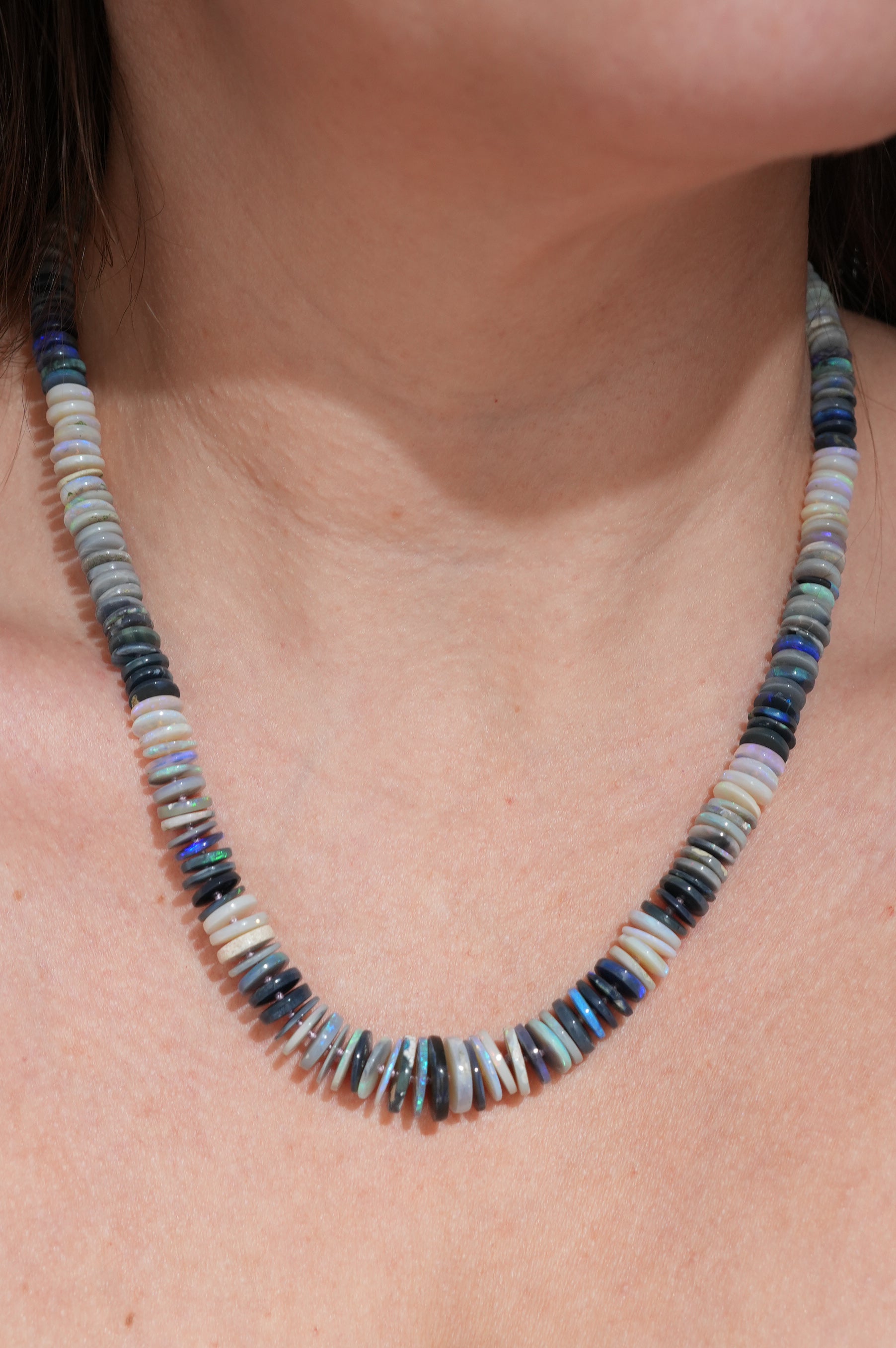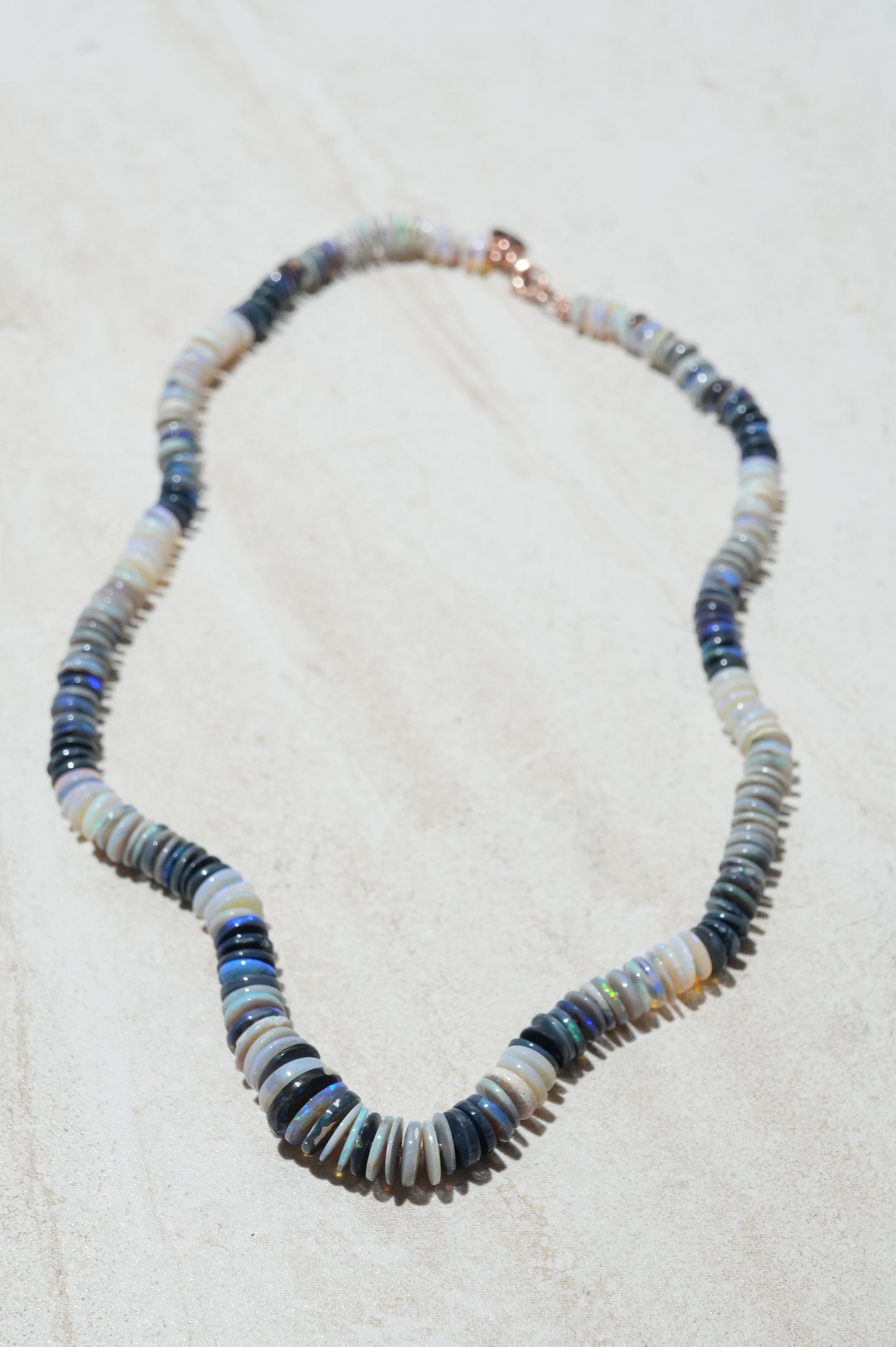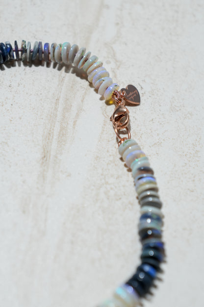 Savor the unparalleled elegance of our Lightning Ridge Opal Knotted Candy Necklace. This masterpiece features a stunning array of light and dark opals with vibrant color play, meticulously hand-knotted with silk for a luxurious finish. The 14k rose gold clasp adds a touch of elegance, making this necklace a unique treasure in your collection.