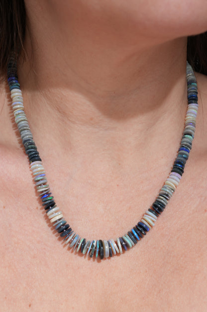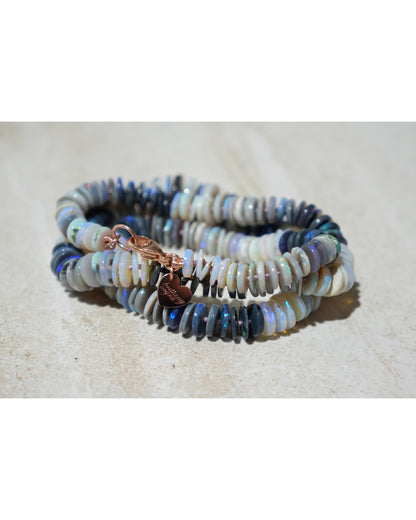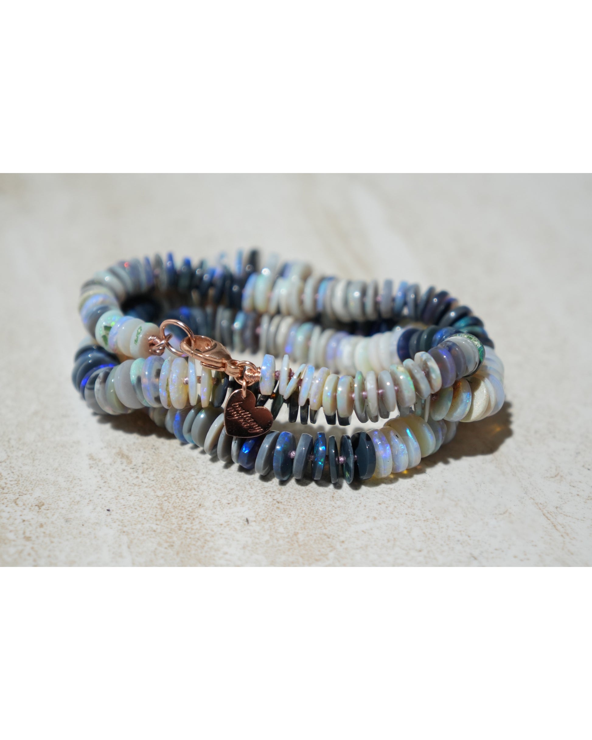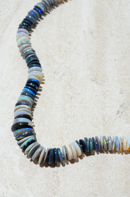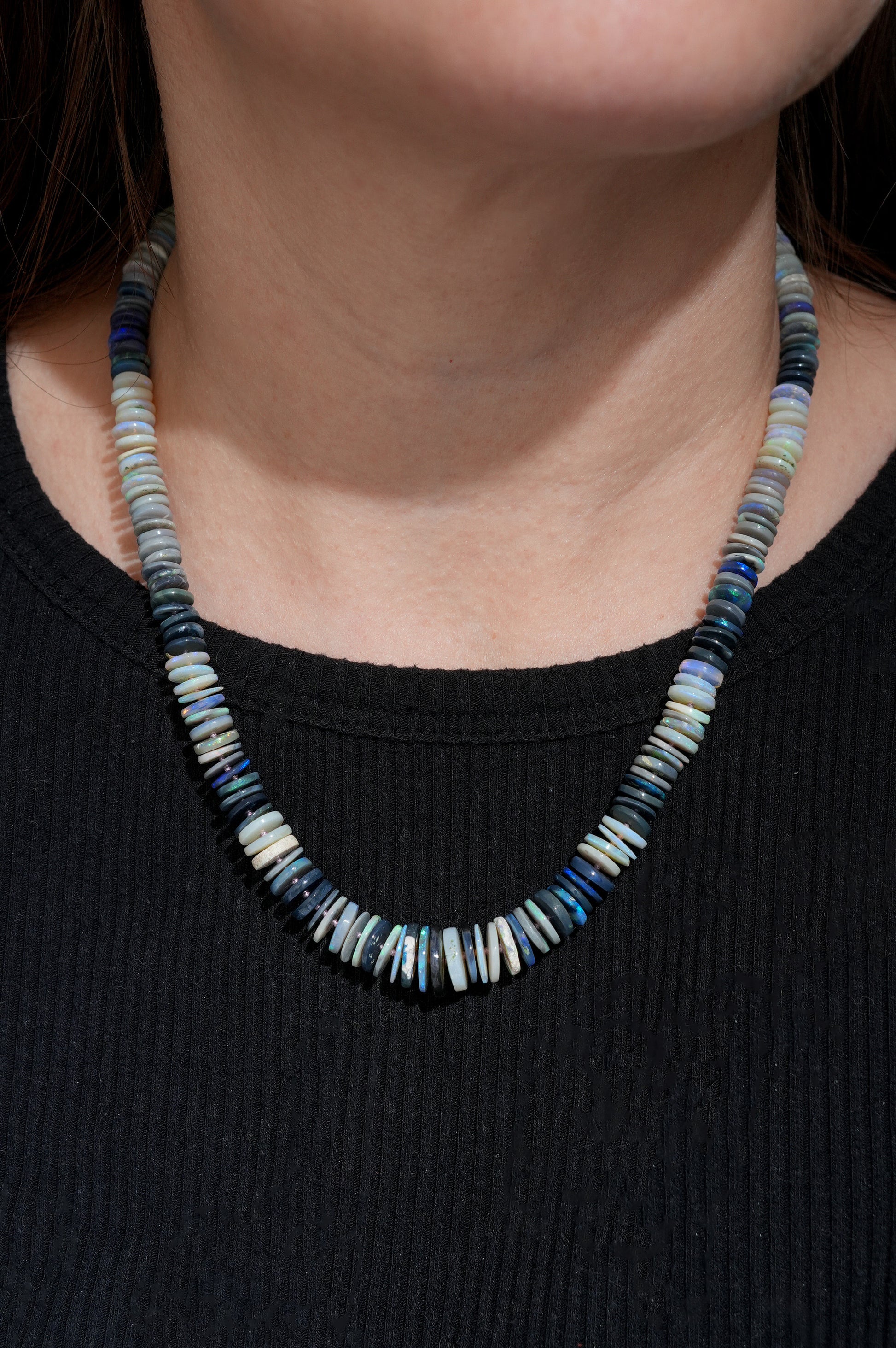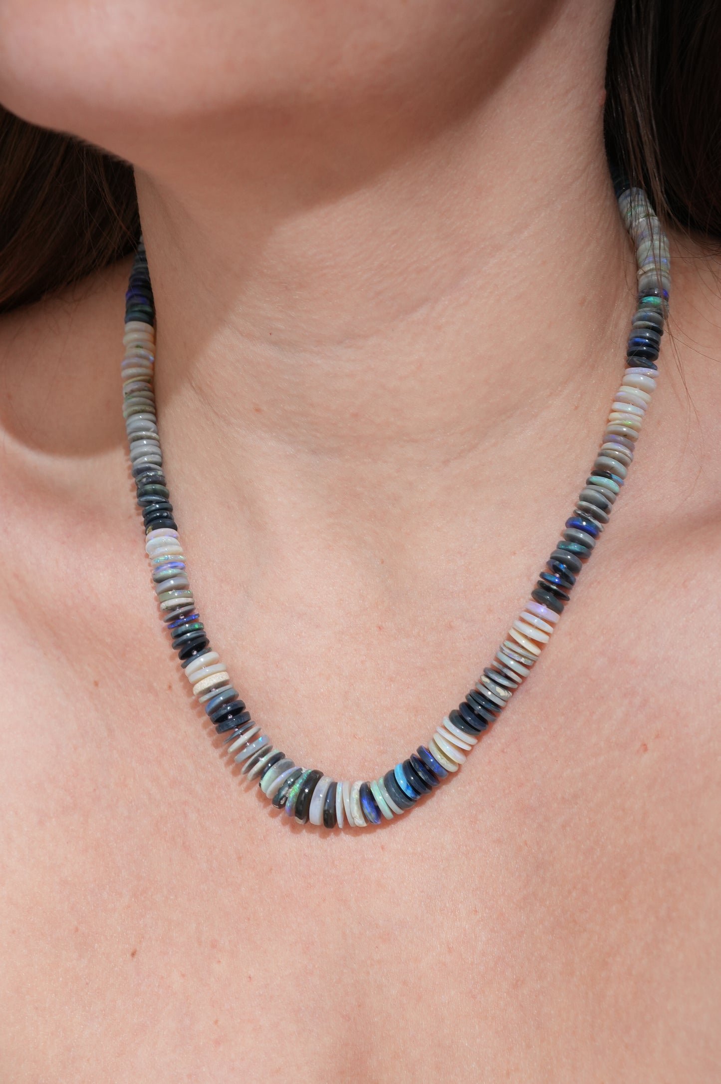 Savor the unparalleled elegance of our Lightning Ridge Opal Knotted Candy Necklace. This masterpiece features a stunning array of light and dark opals with vibrant color play, meticulously hand-knotted with silk for a luxurious finish. The 14k rose gold clasp adds a touch of elegance, making this necklace a unique treasure in your collection.