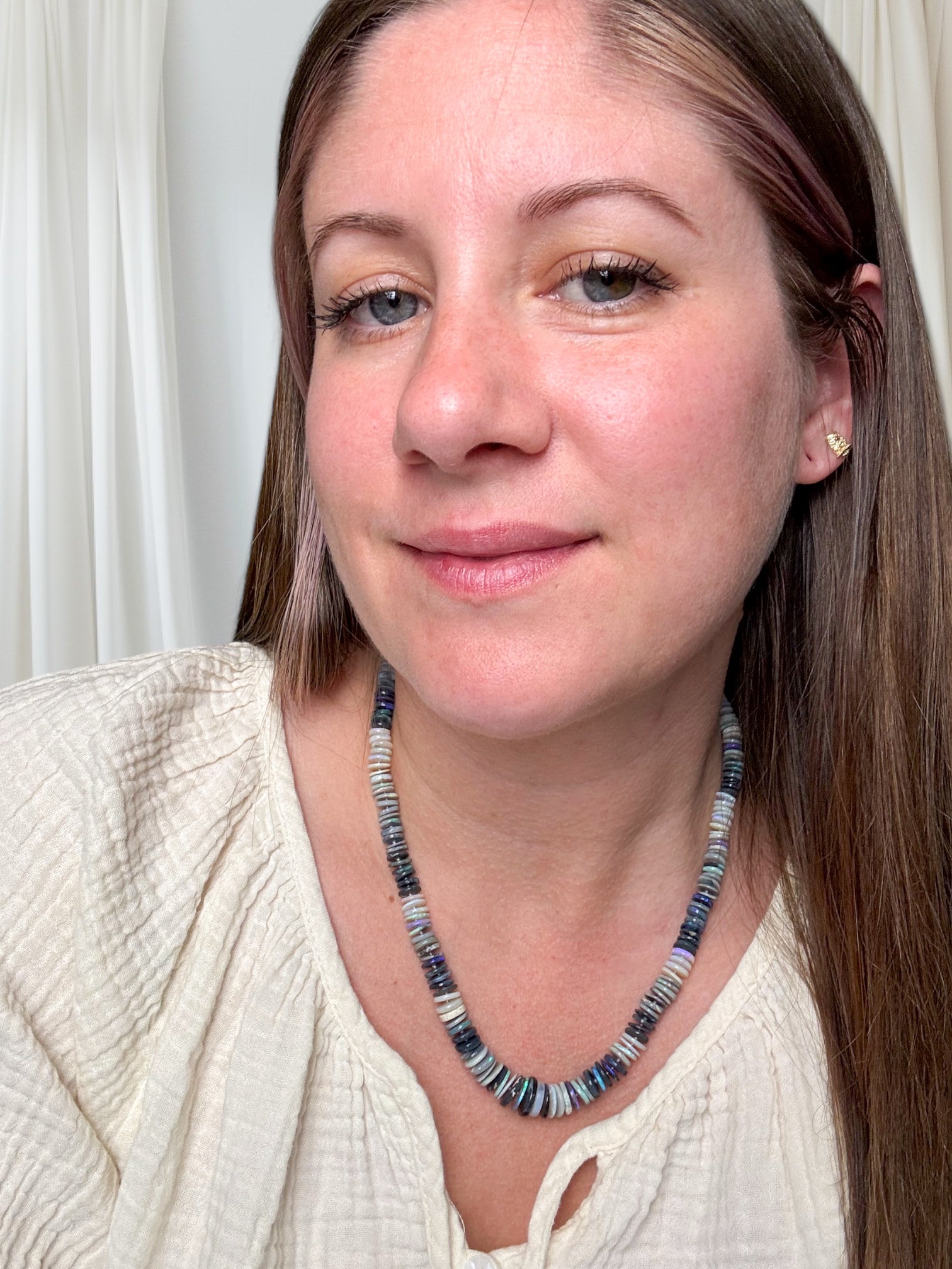 Savor the unparalleled elegance of our Lightning Ridge Opal Knotted Candy Necklace. This masterpiece features a stunning array of light and dark opals with vibrant color play, meticulously hand-knotted with silk for a luxurious finish. The 14k rose gold clasp adds a touch of elegance, making this necklace a unique treasure in your collection.