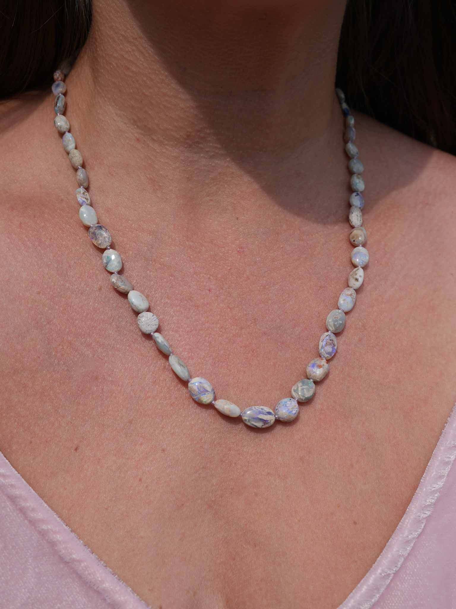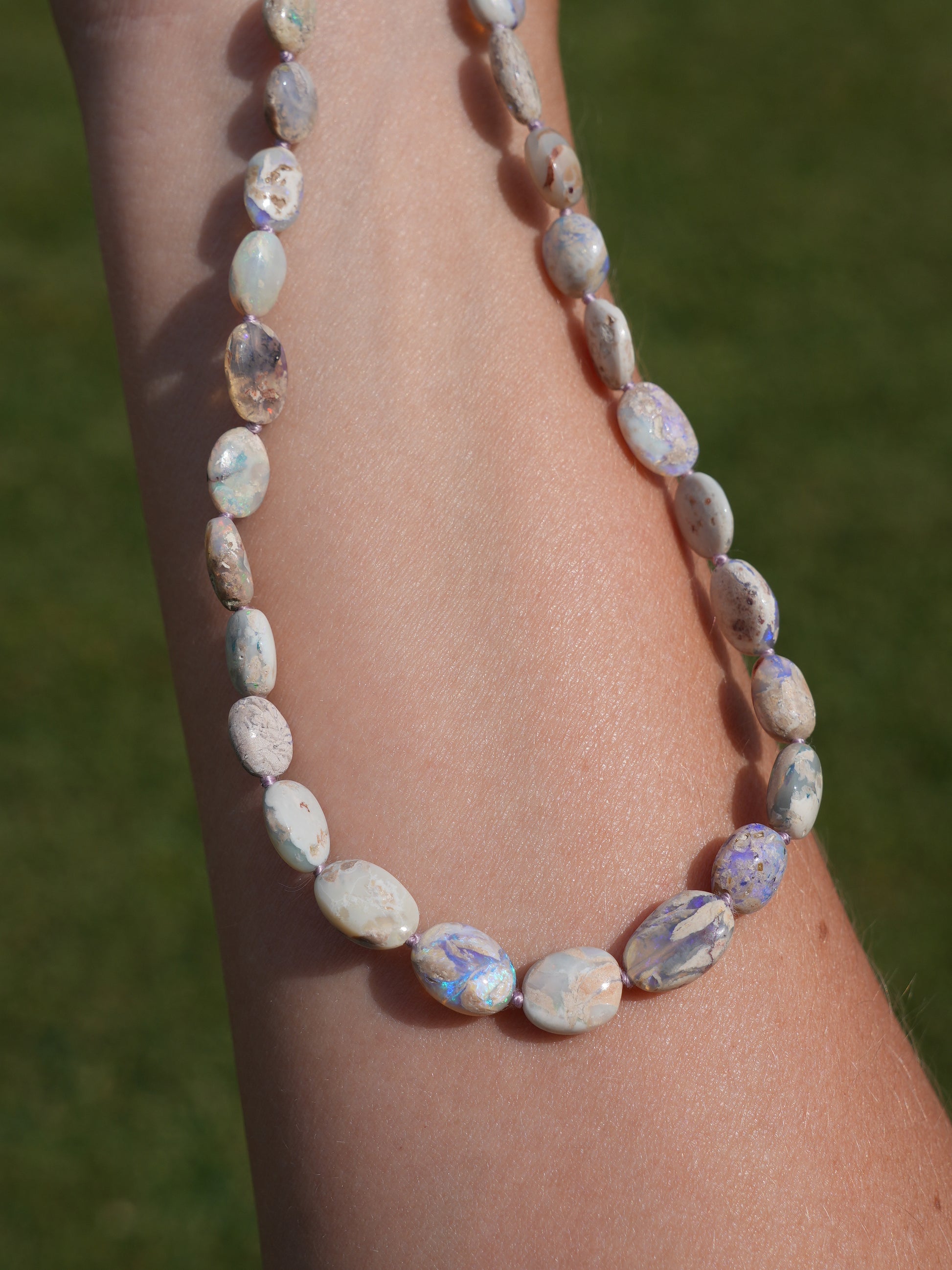 Hand-knotted Australian opal beads with soft creams, lilacs, and flashes of rainbow fire, finished in solid gold. A one-of-a-kind strand that glows with natural artistry and rare beauty.