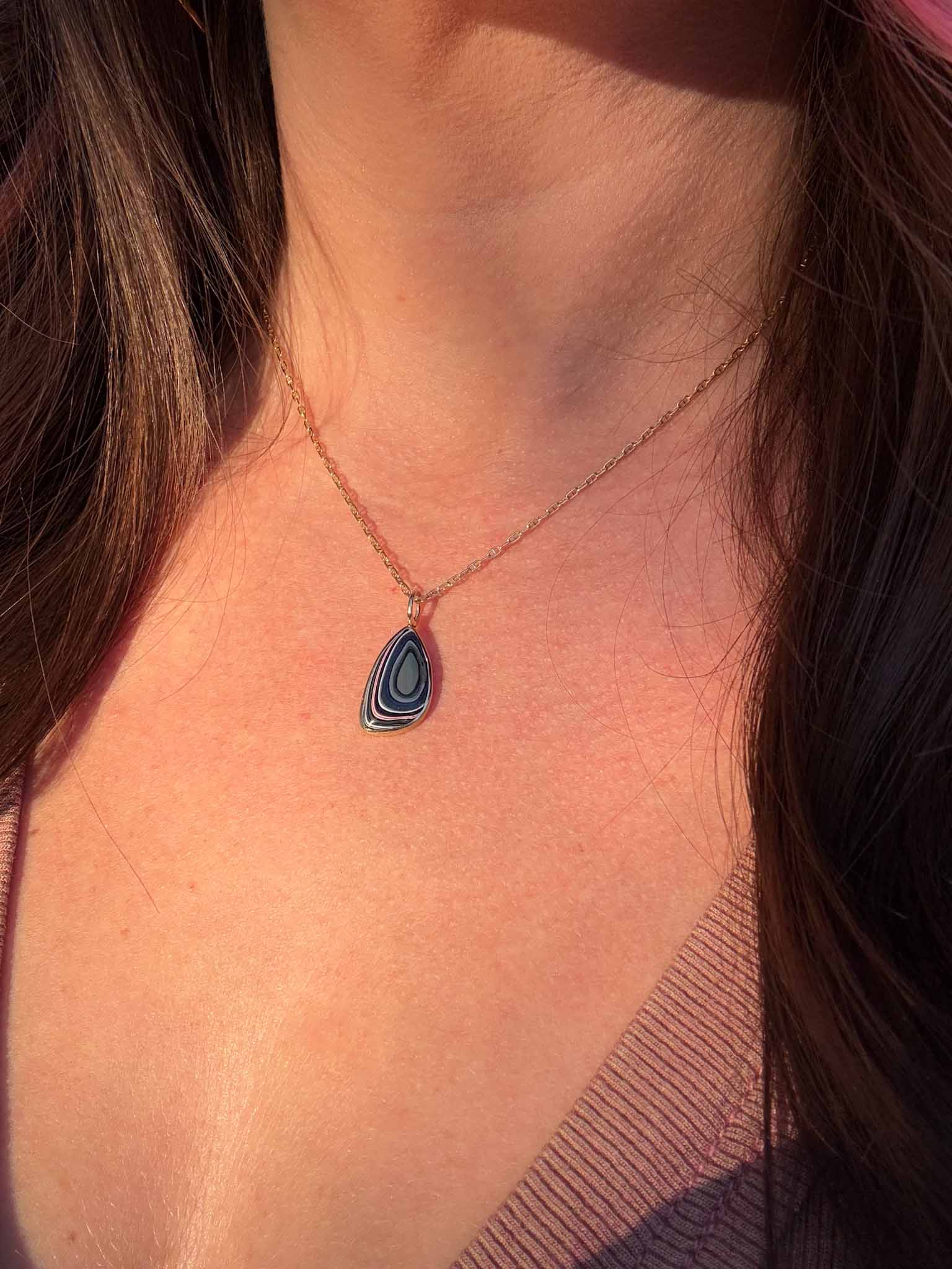 Wrapped in a 14k gold frame with an open back so you can see and appreciate the other side of the charm and the unique layers of paint and color.
