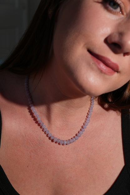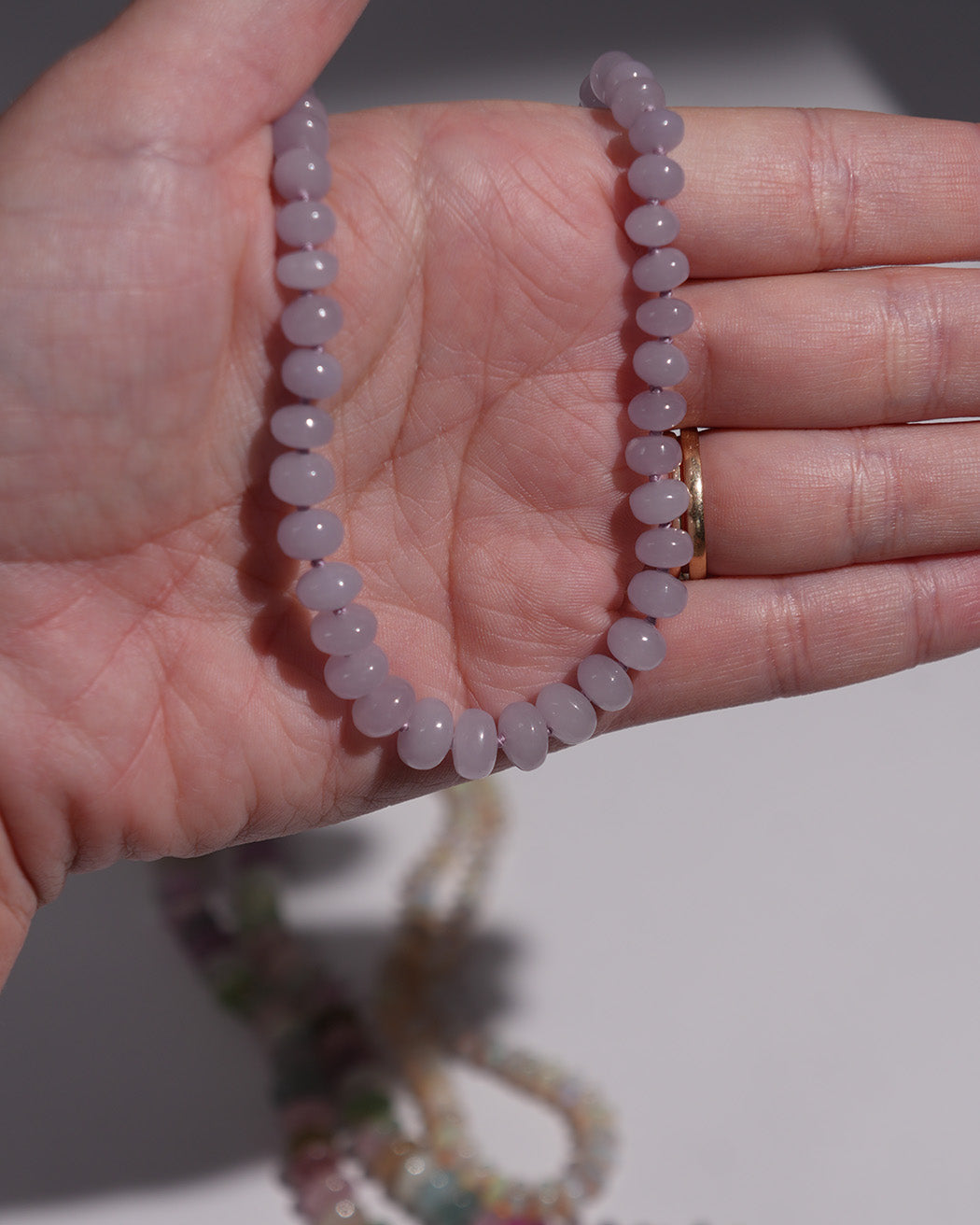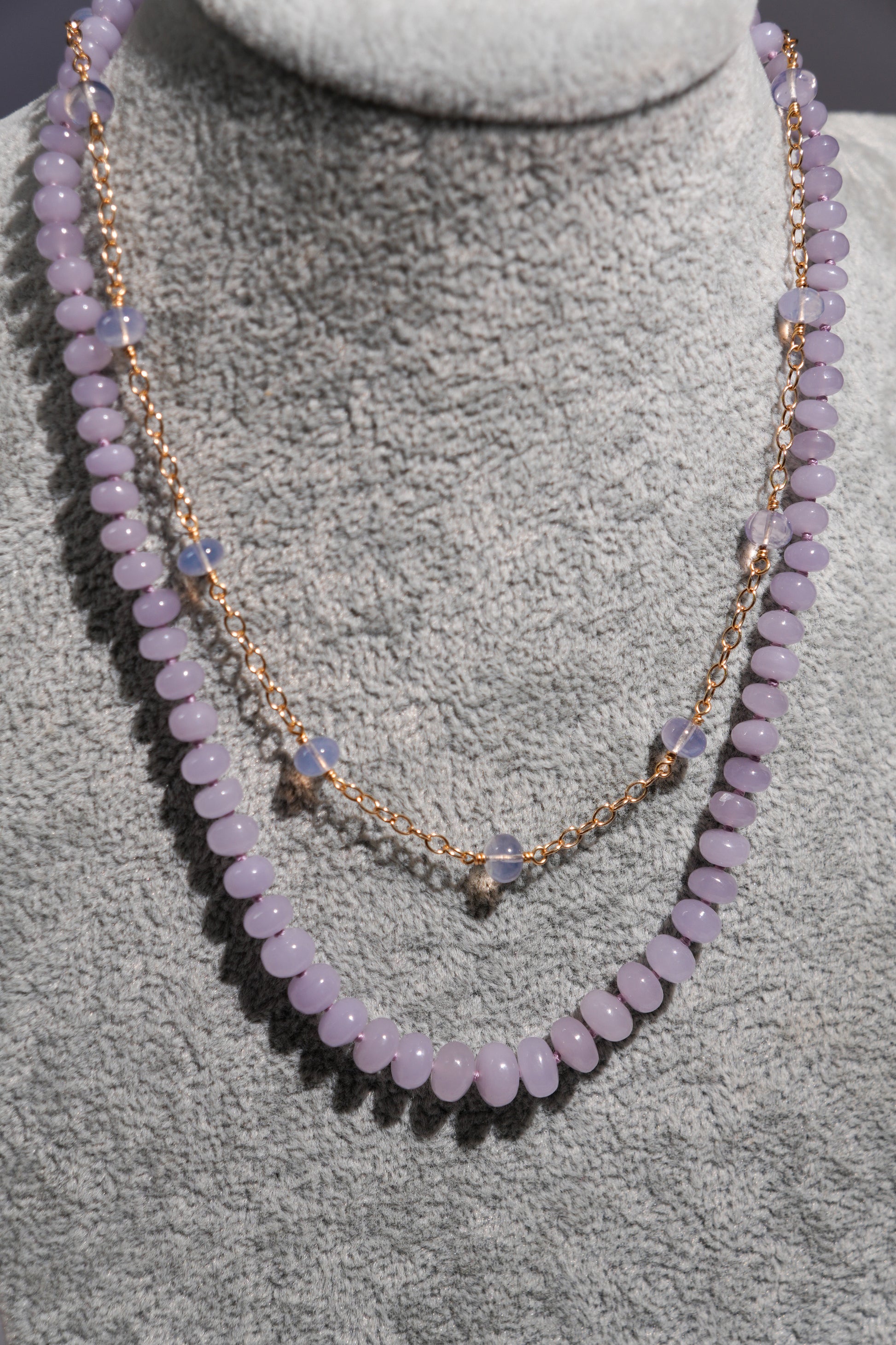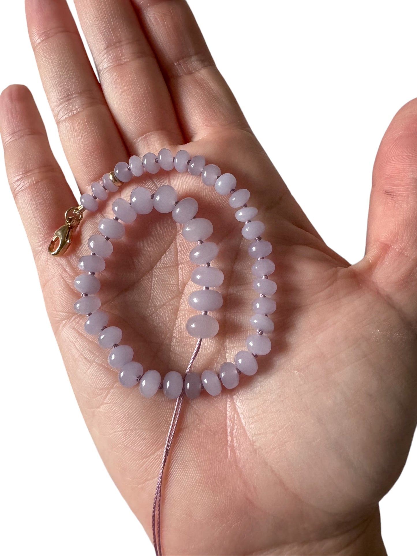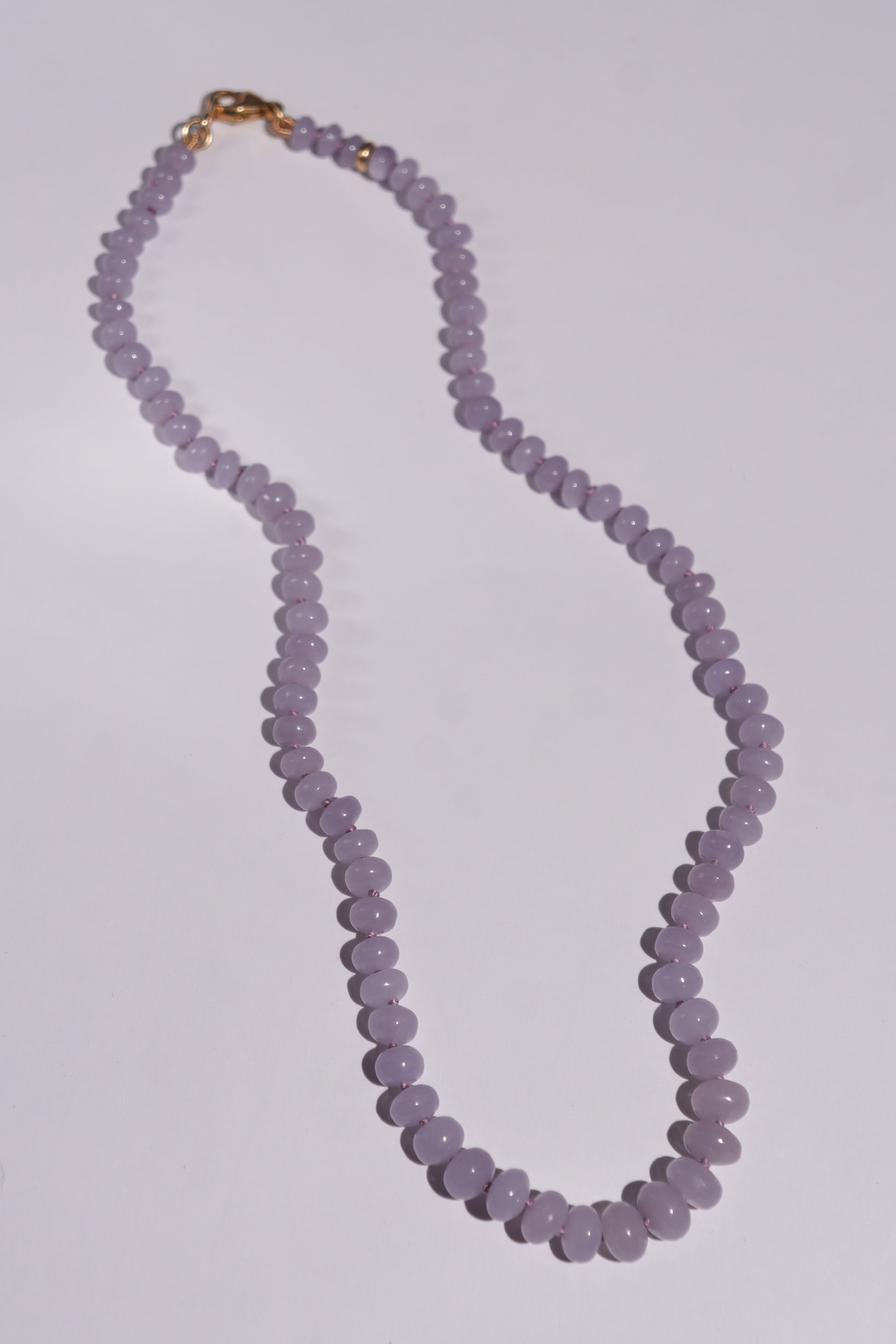 Elevate your style with our Dusty Lavender Fluorite Knotted Candy Bead Necklace, a sophisticated piece that exudes elegance and charm. This necklace features smooth rondelle fluorite beads in a captivating dusty lavender hue, perfectly complemented by the luxurious 14k gold clasp. Each bead is meticulously knotted with lavender silk, ensuring both durability and a touch of refined beauty. The combination of the soft lavender tones and the rich gold creates a harmonious and eye-catching design.